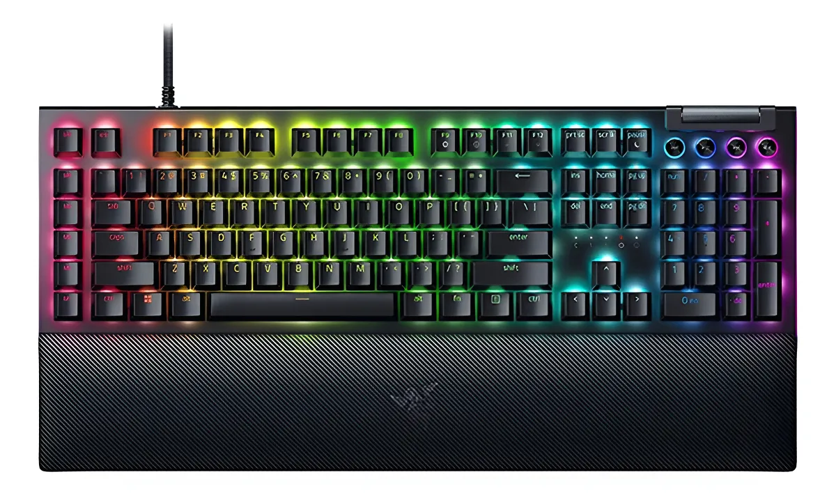 Inmersión de batalla completa. El Razer BlackWidow V4 no es solo un teclado, es el centro de comando de tu setup. Equipado con switches mecánicos Razer™ de última generación, iluminación Razer Chroma™ RGB con resplandor inferior (underglow) en 2 lados y 6 teclas macro dedicadas para que tengas todos tus combos al alcance de un dedo. Incluye reposamuñecas magnético de piel sintética suave.